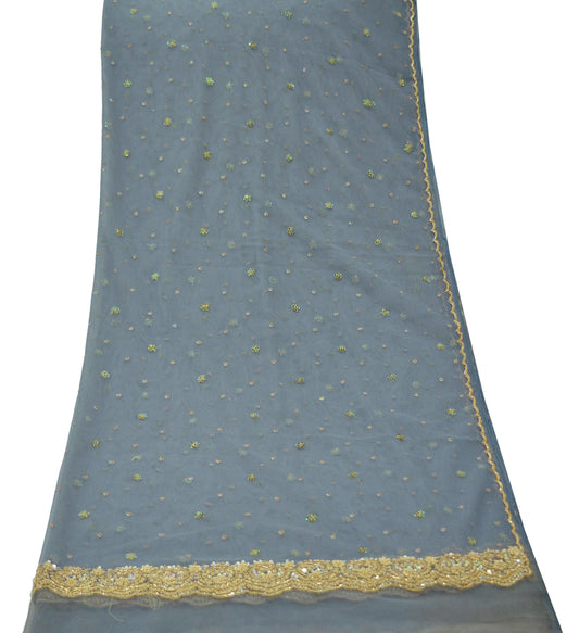 Indian Vintage Gray Dupatta Net Mesh Long Stole Hand Embroidered Scarves Golden Zardozi Zari Sequins Hijab Veil wrap Boho