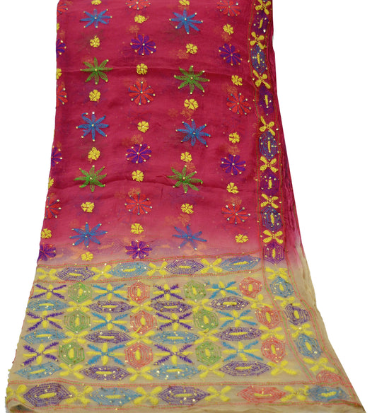 Indian Vintage Dupatta Beige & Red Long Stole Pure Chiffon Silk Hand Embroidered Kantha Veil Hijab