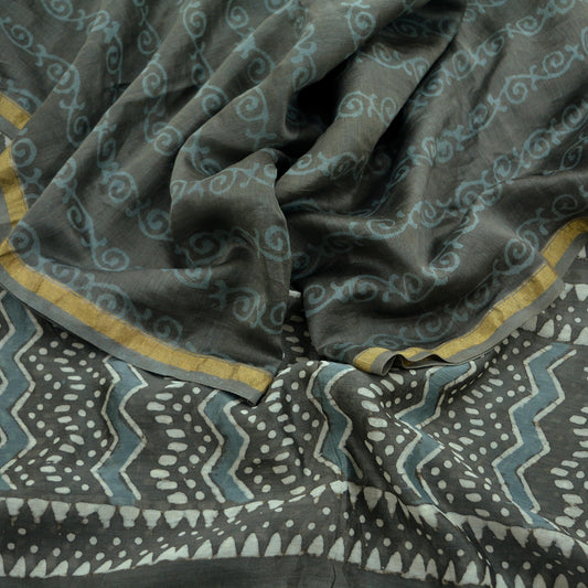 Indian Vintage Dupatta Gray Dupatta Long Stole Block Print Pure Chanderi Silk Scarves Veil Golden Zari