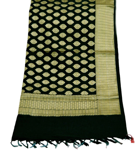 Indian Vintage Dupatta Black & Green Long Stole Hand Woven Pure Chanderi Silk Scarves Veil Zari Soft Fringes Scarf Wrap Boho