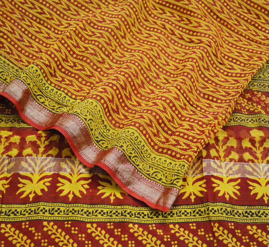 Indian Yellow & Maroon Vintage Dupatta Long Stole Block Print 100% Pure Cotton Indian Scarf Veil Soft Paisley Floral Zari