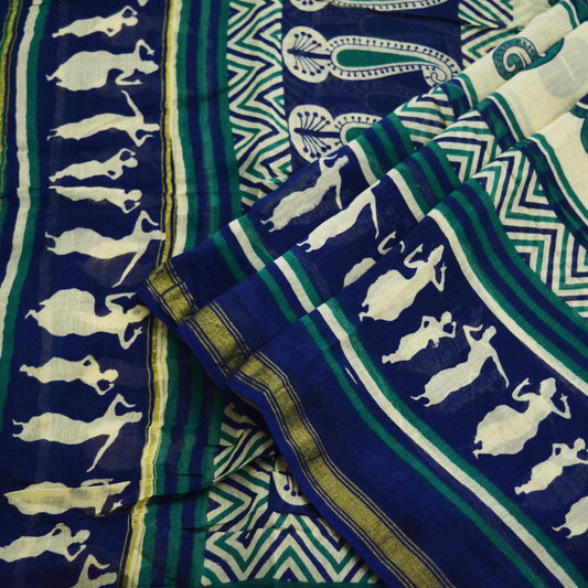 Indian Blue & Ivory Vintage Dupatta Long Stole Warli Print Pure Chanderi Silk Indian Scarves Veil Scarf Golden Zari Soft