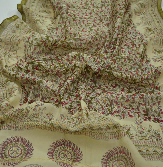 Indian Vintage Dupatta Ivory & Green Long Stole Block Print Pure Chanderi Silk Scarves Veil Golden Zari Floral Design For her Fringes