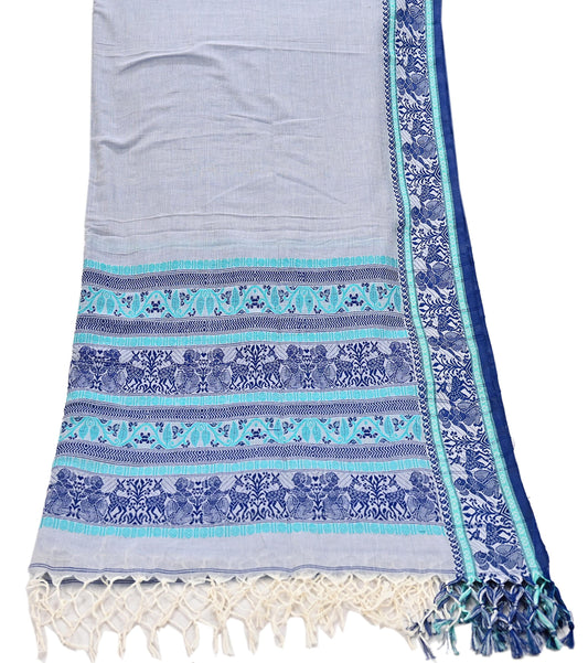 Indian Vintage Dupatta Gray Long Stole Hand Woven Baluchari Pure Cotton Scarves Veil Soft Fringes