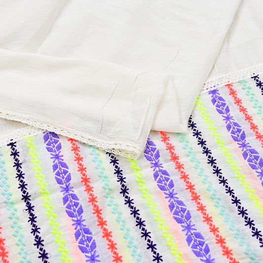 Indian Vintage White Dupatta Long Stole Hand Embroidered Pure Cotton Scarves Veil Mirror Soft Fringes