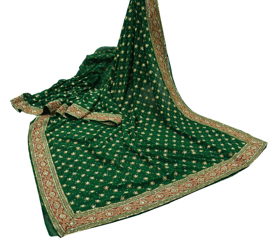 Indian Vintage Green Saree Pure Georgette Silk Hand Beaded Sari Craft Fabric 5Yd Sewing Zari Ethnic Bridal/Wedding Sarees Bollywood sari