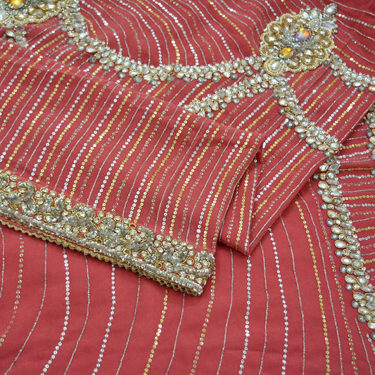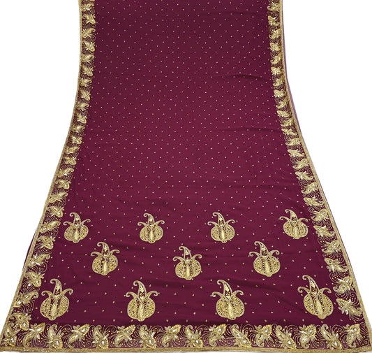 Indian Vintage Maroon Saree Georgette Hand Beaded Sari Fabric 5Yard Sewing Soft Ethnic Glass Beaded