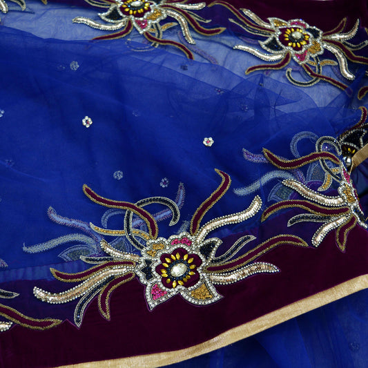 Indian Vintage Heavy Blue Saree Net/Mesh Hand Beaded Sari Fabric 5Yd Sewing Soft Ethnic Zardozi/ Dabka Wedding Bollywood Sarees
