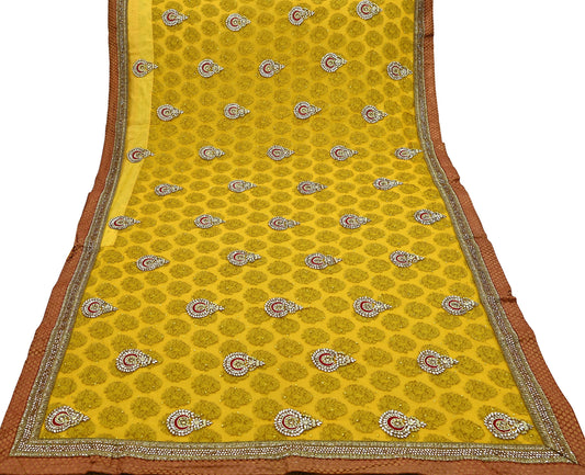 Indian Vintage Heavy Yellow Saree Georgette & Net Hand Beaded Sari Fabric 6Yd Sewing Soft Ethnic Wedding Sarees With Blouse