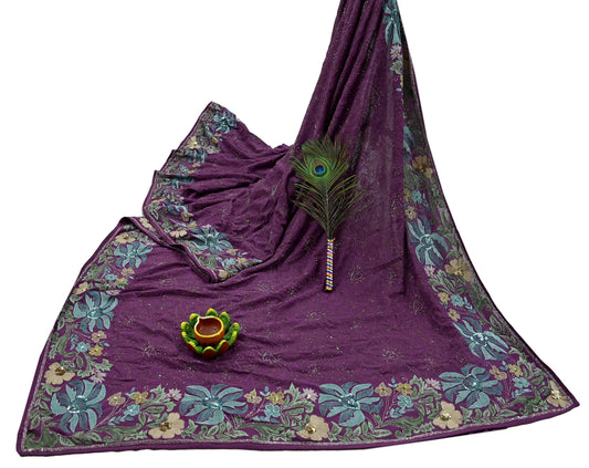 Indian Vintage Purple Saree Pure Georgette Silk Hand Beaded Sari Fabric 5Yd Sewing Soft Ethnic Dress making Crafting Bollywood Party Wear