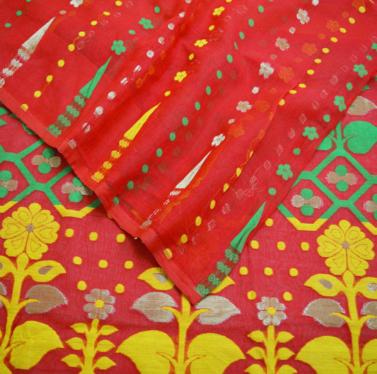 Indian Vintage Sari Red Hand Woven Sari Cotton Saree Fabric 5Yard Floral Soft Golden Zari