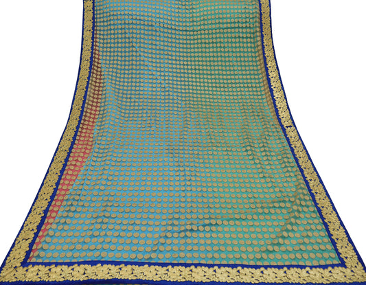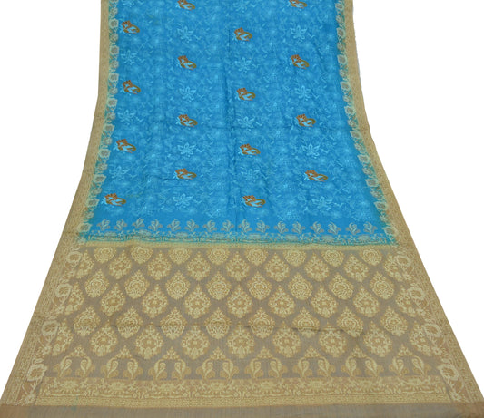 Indian Vintage Sari Cream & Blue Hand Woven Sari Blend Georgette Saree Fabric 5Yard Floral Soft Golden Zari