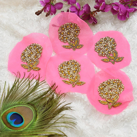 Indian Vintage Pink Pure Georgette Silk Appliques Set of 5 Hand-Embroidered Floral Patches with Zardozi, Dabka, for Craft, Journals 3x2"