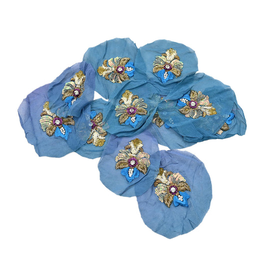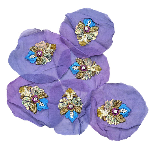 Indian Vintage Purple & Blue Pure Georgette Silk Appliques Set of 6 Hand-Embroidered Patches with Zardozi, Dabka ,for Craft Journals 3x2.5"