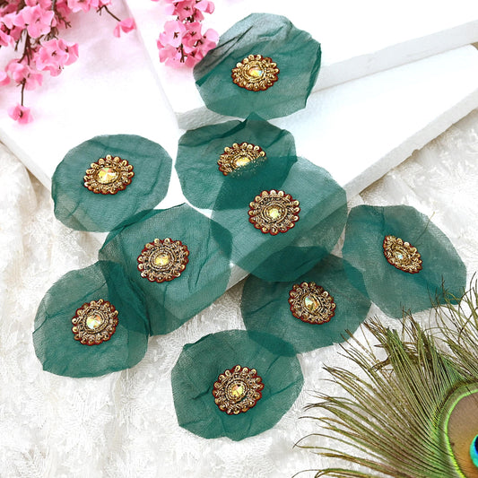 Indian Vintage Green Pure Georgette Silk Appliques Set of 9 Hand-Embroidered Floral Patches with Zardozi, Dabka for Craft Journals 1.2x1.2"