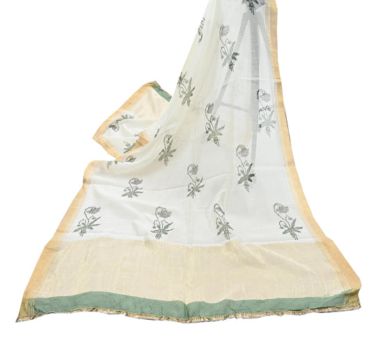 Indian Vintage Dupatta Ivory Dupatta Long Stole Block Print Pure Chanderi Silk Scarves Veil Golden Border