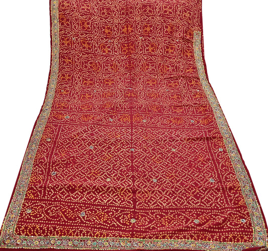 Indian Vintage Maroon Saree Hand Embroidered Bandhani Printed Sari 100% Pure Crepe Silk Indian Sari Fabric 5yard Soft Craft Fabric Beaded