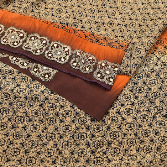Indian Vintage Sari Beige & Brown Pure Crepe Silk Hand Embroidered Sarees 5yd Sewing Floral Craft Sequins Dress making Crafting Quilting
