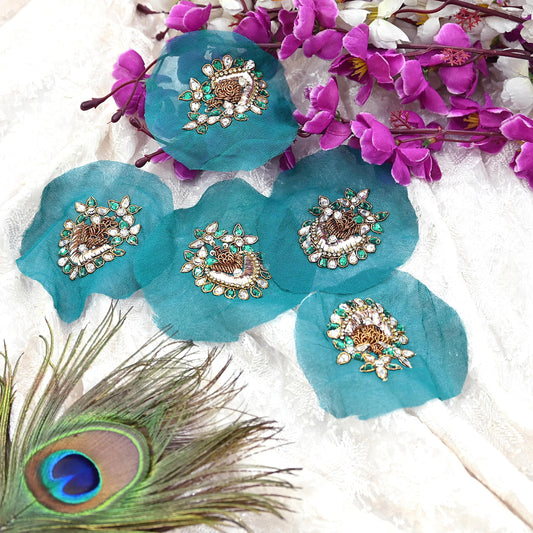 Indian Vintage Green Pure Georgette Silk Appliques Set of 5 Hand-Embroidered Floral Patches with Zardozi, Dabka ,for Craft, Journals 2.5x2"