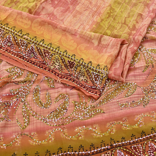 Indian Vintage Beige & yellow Saree Pure Georgette Silk Hand Embroidered Mukesh Sari Fabric 6Yard Sewing Soft Ethnic Sequins Paisley