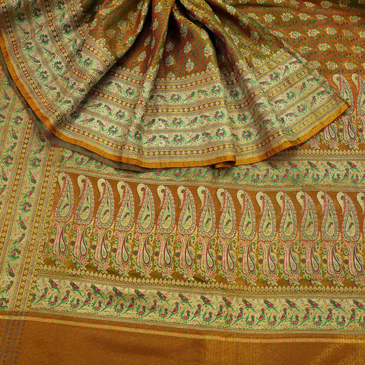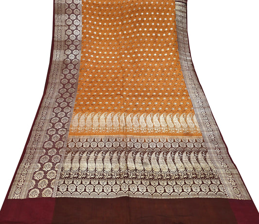 Indian Vintage Sari Brown & Mustard Heavy Pure Satin Silk Woven Banarasi Tanchoi Saree 5Yd Ethnic Craft Fabric Upcycle Bridal Heavy Sarees