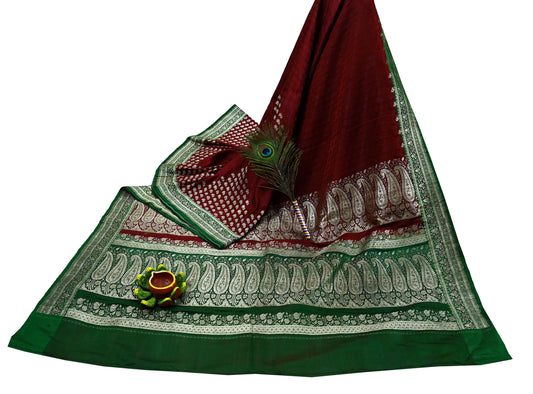 Vintage Banarasi Saree Pure Satin Silk Woven Brocade Zari Fabric Maroon & Green Heavy Craft Sari 5 Yards Indian Antique Textile Dress Making