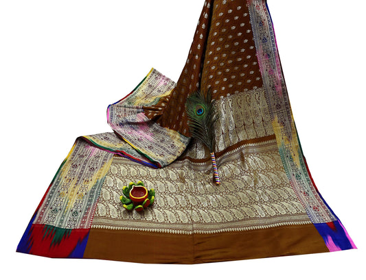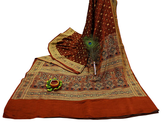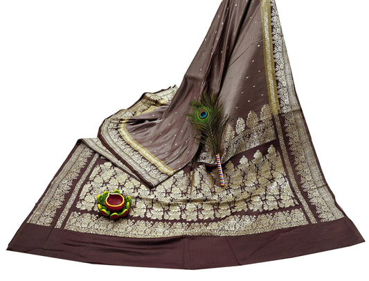 Indian Vintage Sari Brown Heavy Wedding Pure Satin Silk Woven Banarasi Brocade Saree Zari 5Yd Craft Fabric Ethnic Dress making Crafting