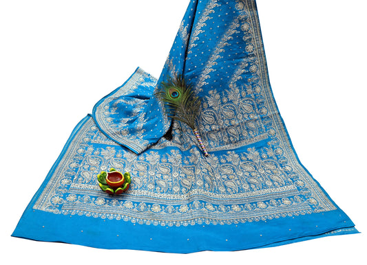 Indian Vintage Blue Heavy Wedding Saree Pure Satin Silk Hand Embroidered Banarsi Brocade Indian Sari Zari/Zardozi/Dabka 5Yd