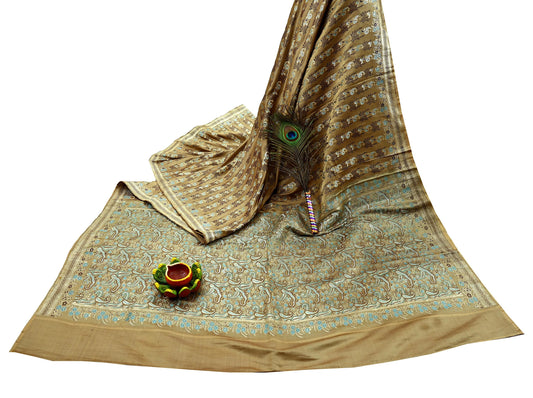 Vintage Beige Banarasi Silk Saree Pure Satin Silk Handwoven Tanchoi Fabric with Floral Weave 5 Yard Dressmaking Craft Material