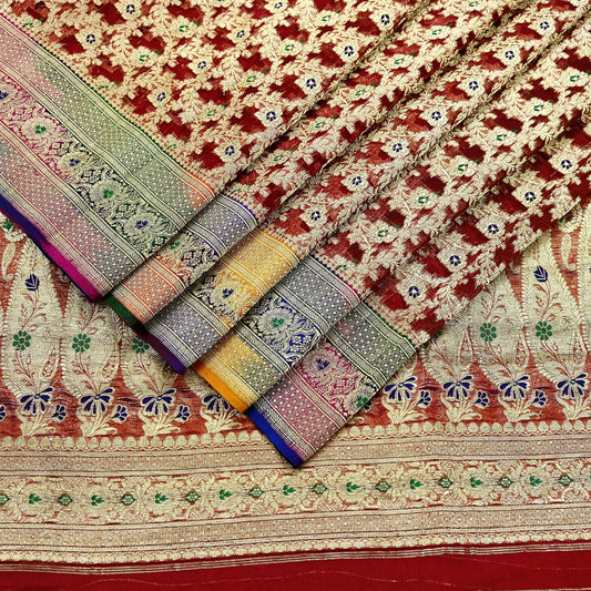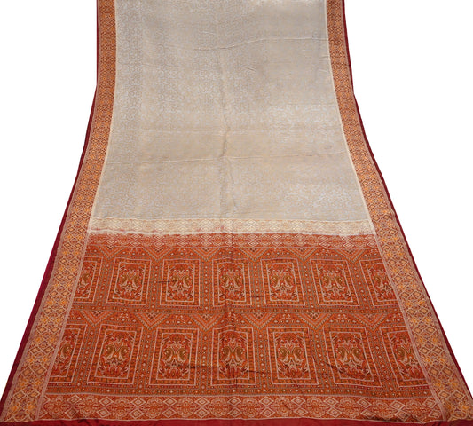 Vintage Banarasi Saree Pure Satin Silk Woven Brocade Zari Fabric Beige Maroon Heavy Craft Sari 5 Yards Indian Antique Textile Dress Making