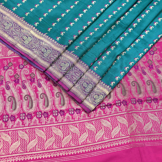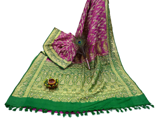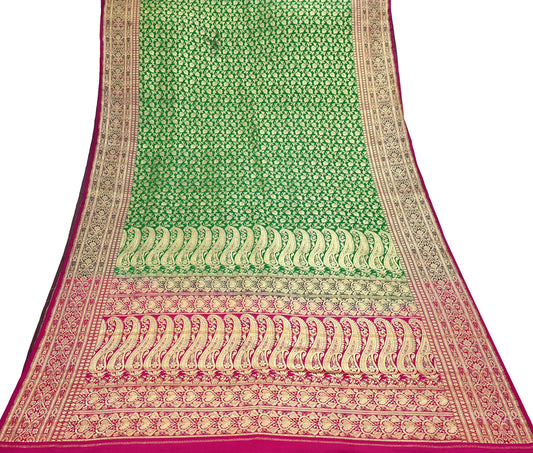 Vintage Banarasi Silk Saree Rani Pink Green Heavy Satin Silk Brocade Fabric Golden Zari Bridal Wedding Crafting 5 Yard