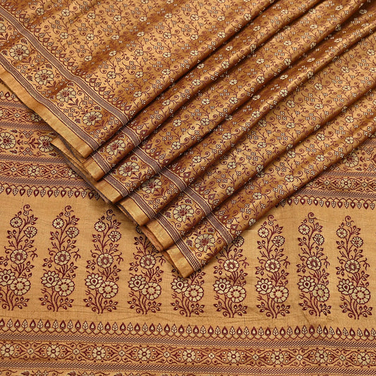 Indian Vintage Sari Golden Brown Heavy Pure Satin Silk Hand Woven Tanchoi Sarees Ethnic Wear 5Yd Paisley Craft Fabric Dress Making Crafting