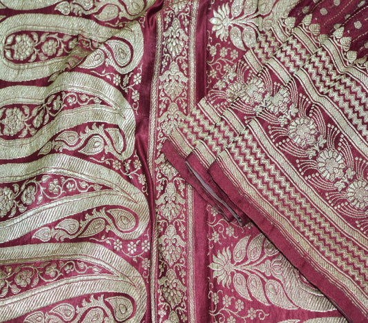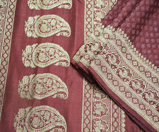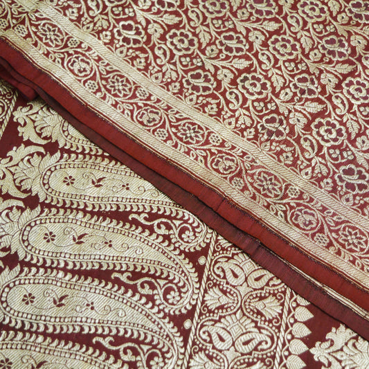 Indian Vintage Sari Maroon Heavy Wedding Pure Satin Silk Woven Banarasi Brocade Saree Golden Zari 5Yd