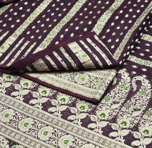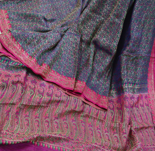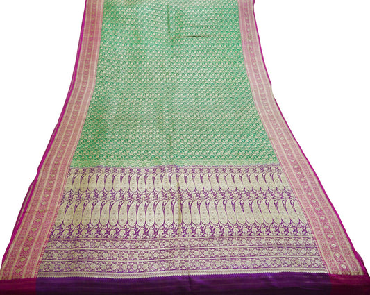 Indian Vintage Sari Green & Purple Heavy Wedding Pure Satin Silk Banarasi Brocade Saree Zari 5Yd