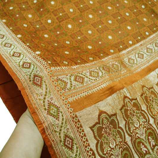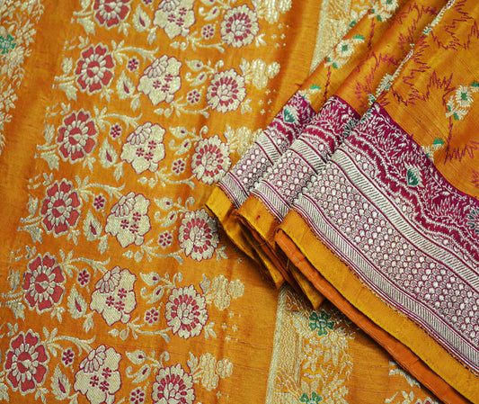 Indian Vintage Sari Saffron Heavy Wedding Pure Satin Silk Woven Banarasi Brocade Saree Golden Zari 5Yd