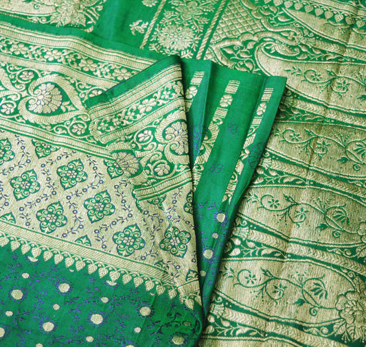 Indian Vintage Heavy Wedding Sari Green Pure Satin Silk Woven Banarasi Tanchoi Sarees Zari 5Yd Ethnic Craft Fabric Upcycle Dress Making Used