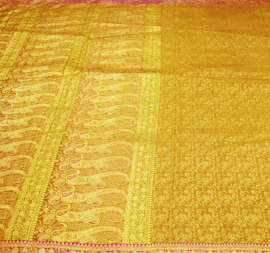 Indian Vintage Sari Mustard Heavy Wedding Pure Satin Silk Woven Banarasi Brocade Saree Golden Zari 5Yd