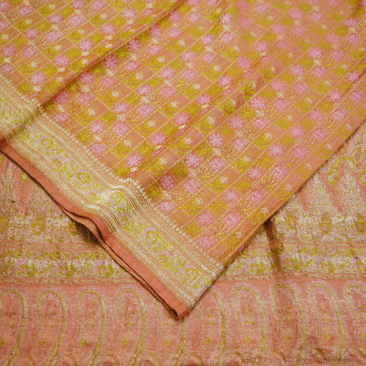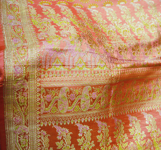 Indian Vintage Sari Heavy Wedding Pure Satin Silk Peach Woven Banarasi Brocade Saree Zari 5Yard