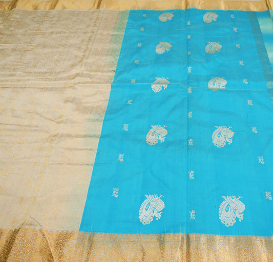 Indian Vintage Sari Heavy Blue Pure Silk Woven Brocade Saree 5Yard Golden Zari Floral