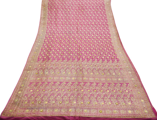 Vintage Sari Pink Heavy Wedding Pure Satin Silk Hand Embroidered Banarsi Brocade Saree Zari/Zardozi/Dabka 5Yd