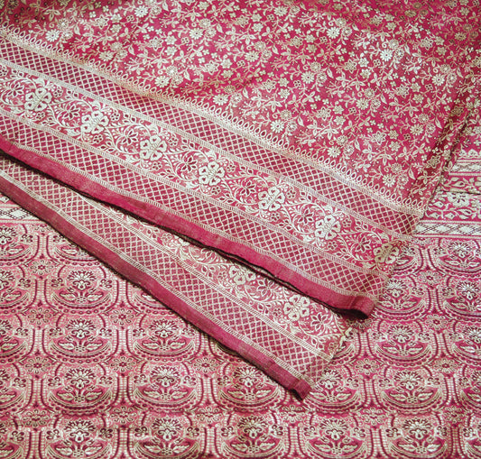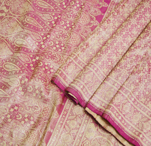 Indian Vintage Sari Pink Heavy Wedding Pure Satin Silk Woven Banarasi Brocade Saree Golden Zari 5Yard