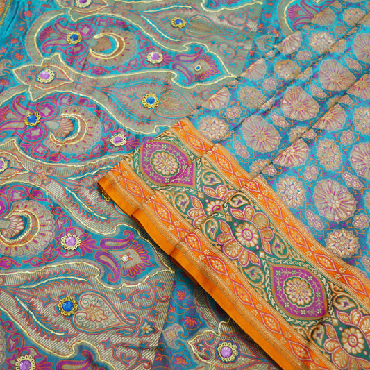 Vintage Sari Blue Heavy Wedding Pure Satin Silk Hand Embroidered Banarsi Brocade Saree Zari/Zardozi/Dabka 5Yd