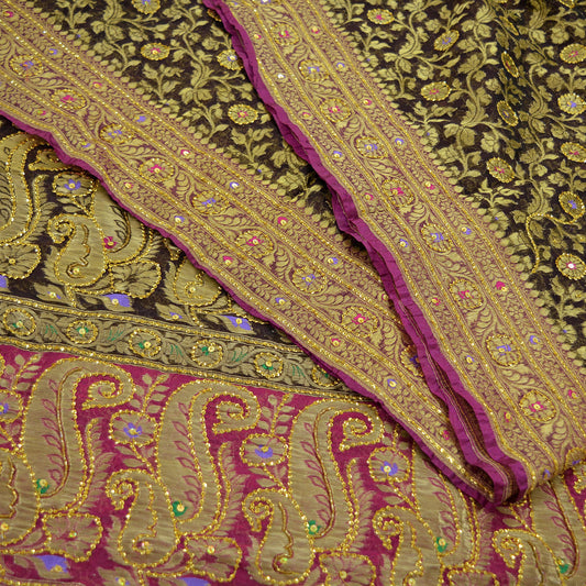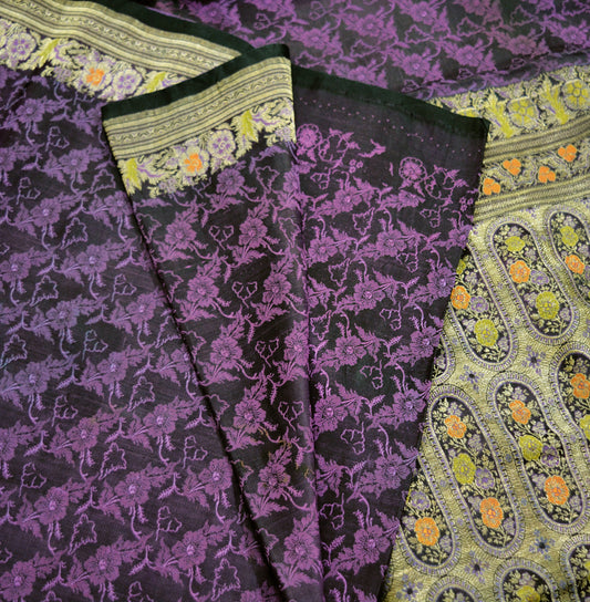 Vintage Sari Black & Purple Heavy Wedding Pure Satin Silk Woven Banarasi Brocade Saree Golden Zari 5Yard