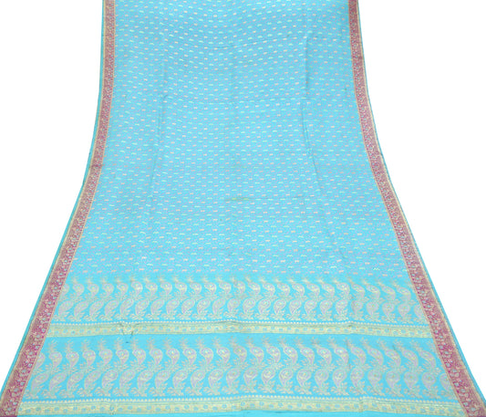 Indian Vintage Sari Blue Heavy Pure Satin Silk Hand Woven Tanchoi Sarees Ethnic Wear 5Yd Paisley Craft Fabric Dress Making Crafting