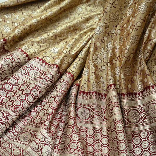 Indian Vintage Golden Beige & Red Heavy Saree Pure Satin Silk Woven Brocade Banarasi Sari Fabric Zari Ethnic 5Yd Bridal Wedding Sarees