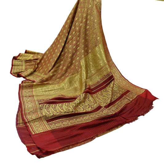 Indian Vintage Sari Dark Red Heavy Wedding Pure Satin Silk Woven Banarasi Brocade Saree Golden Zari 5Yd