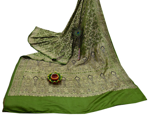 Indian Vintage Sari Bottle Green Heavy Wedding Pure Satin Silk Woven Banarasi Brocade Saree Zari 5Yard
