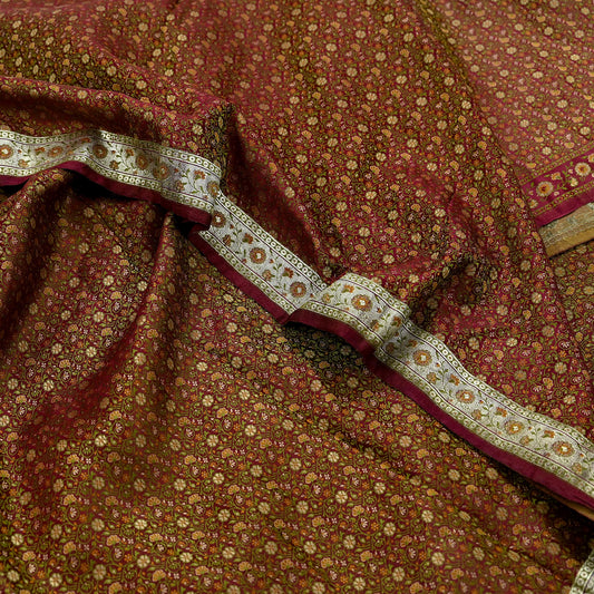 Indian Vintage Sari Maroon Heavy Wedding Pure Satin Silk Woven Banarasi Tanchoi Saree 5Yd Ethnic Craft Fabric Upcycle Bridal Heavy Sarees