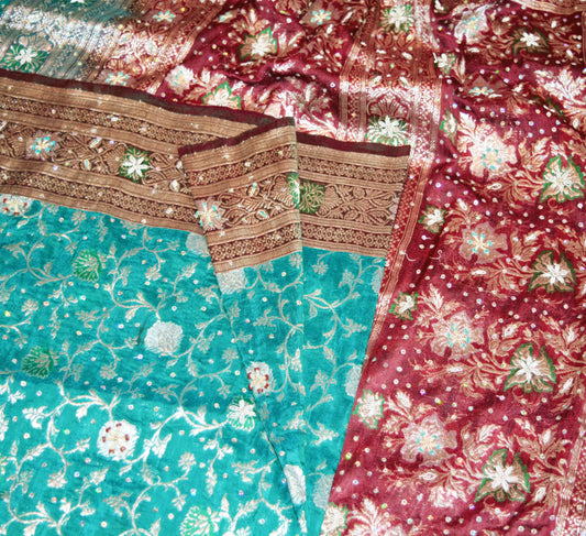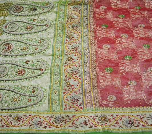 Antique Vintage Sari Green & Red Heavy Pure Silk Hand Embroidered Brocade Saree Zari/Zardozi/Dabka 5Yd