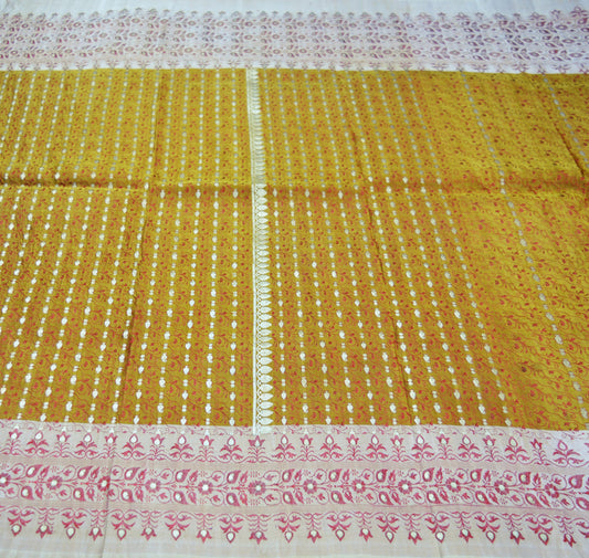 Indian Vintage Sari Mustard Heavy Pure Satin Silk Hand Woven Brocade Saree Ethnic Wear 5Yard Floral